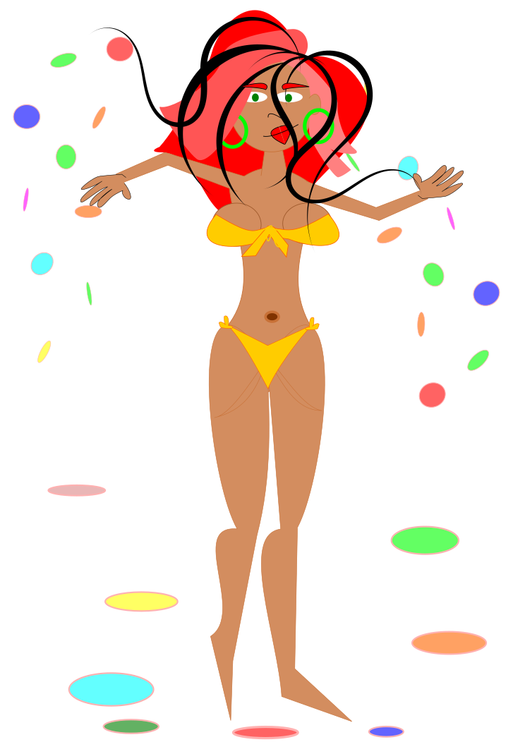 This features a woman in a bikini, standing on one foot and holding her arms out to the side. She has red hair and is wearing a yellow bikini. The scene appears to be set against a backdrop of confetti falling around her, adding a festive atmosphere to the picture.