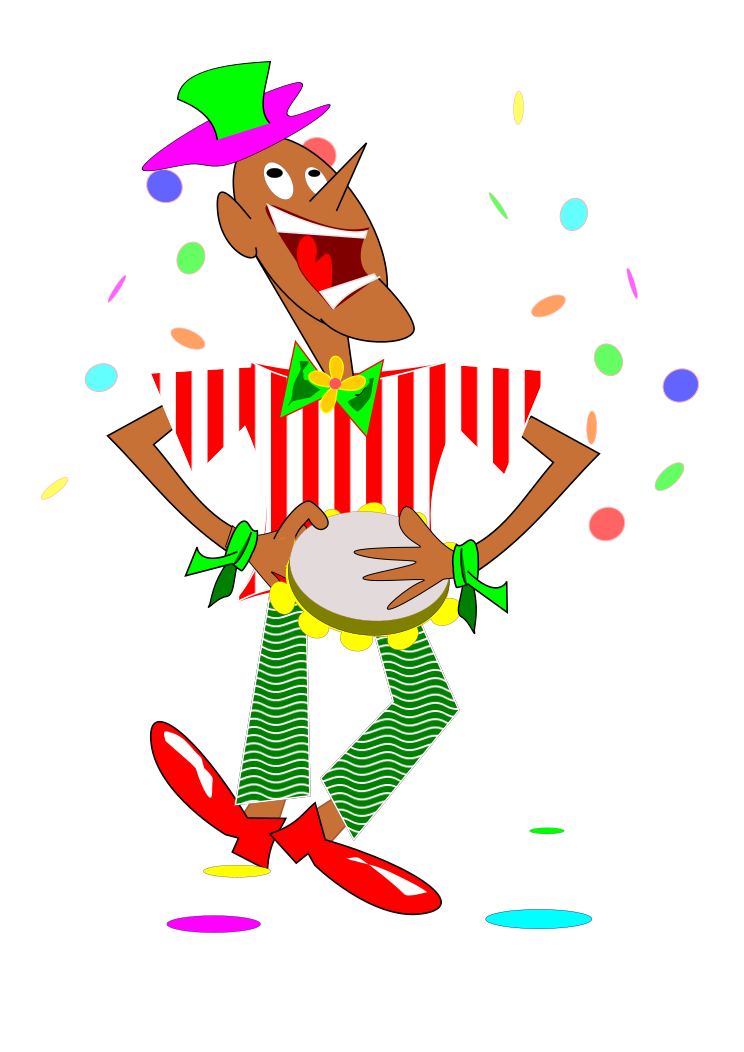 This features a colorful cartoon character, possibly a clown or a jester, wearing a striped shirt and holding a drum. He is standing in the center of the scene with his arms outstretched, as if celebrating or performing for an audience. The character appears to be enjoying himself, as evidenced by his playful facial expression. In addition to the main character, there are several confetti pieces scattered throughout the image, adding a festive and lively atmosphere to the scene. These confetti pieces can be found in various locations around the character, including near his feet, on the ground, and even above him. The combination of the colorful cartoon figure and the confetti creates an engaging and entertaining visual experience.