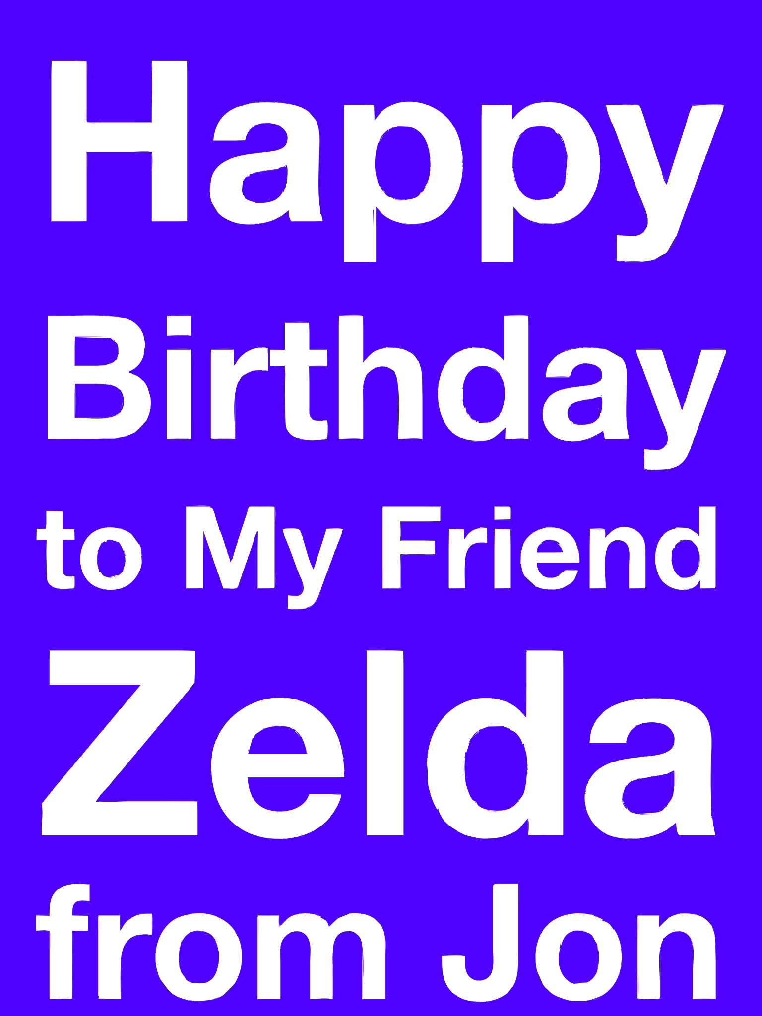 This features a purple birthday card with white text that reads "Happy Birthday to My Friend Zelda from Jon." The card is likely being sent to someone named Zelda, and the sender's name is Jon. This card could be used for various occasions such as a birthday celebration or simply as a thoughtful gesture to express friendship and appreciation towards the recipient.