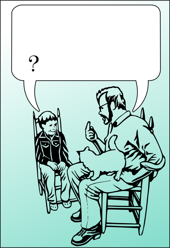 This features a man sitting in a chair with his child, both of them engaged in conversation. The man is holding a cat on his lap while the child sits beside him. They are surrounded by chairs and a dining table, creating an intimate atmosphere for their discussion. Above their heads, there is a chat bubble containing a question mark, suggesting that they might be discussing something interesting or important. The scene appears to be a casual family moment where the father shares his thoughts with his child in a comfortable setting.