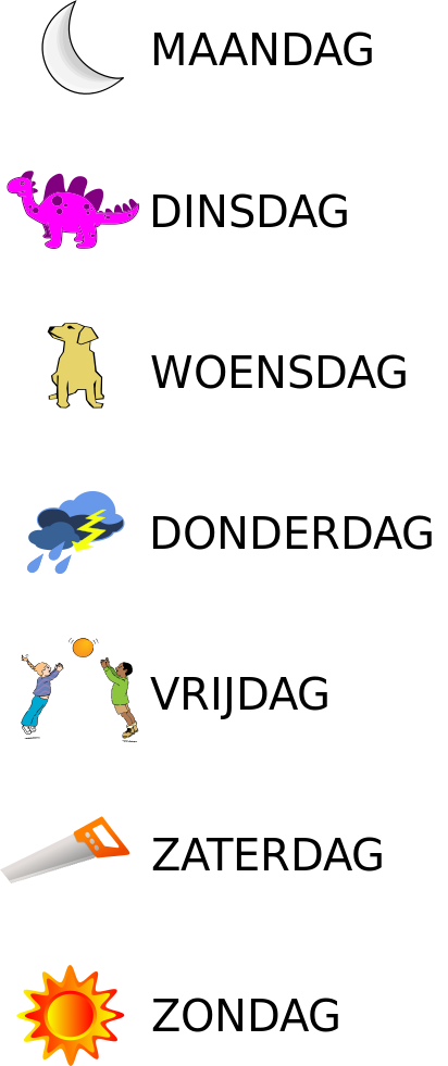 Tags: maan dag, dins dag, donderdag, vrijdag, zaterdag