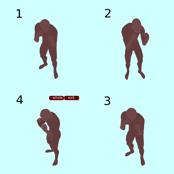 This features four different poses of a man in various stages of a fighting stance. Each pose is depicted as a black silhouette, showcasing the man's body position and posture. These images are arranged in a grid-like pattern, with each pose occupying one square on the grid. The first pose shows the man standing up straight, while the second pose has him bending over to his left side. In the third pose, he is leaning back slightly, and finally, the fourth pose displays the man kneeling down. These images capture different moments of a person's fighting stance, highlighting their body movements and posture during such an action-packed scene.