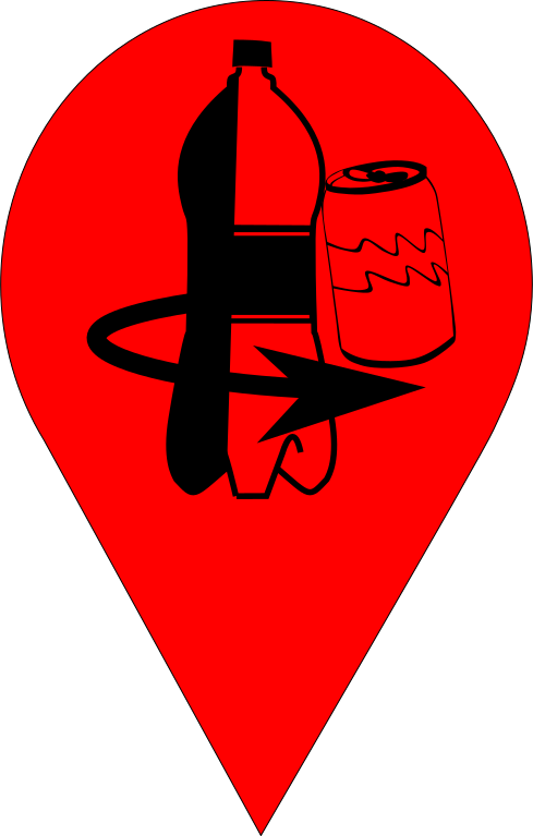This features a red and white map marker with an arrow pointing to the left. On top of this marker, there is a bottle of soda, a can of soda, and a water bottle. These items are placed in such a way that they appear to be on the map itself, creating a unique visual representation of these commonplace objects. The combination of the map marker and the various drink containers creates an interesting juxtaposition between the real world and the cartographic representation of it.