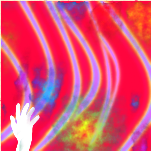 This features a white hand placed on top of an abstract, colorful background. The background is predominantly red with blue lines and has some abstract spots. The hand appears to be reaching out towards the vibrant scene, creating a sense of depth and interaction with the artwork. The combination of colors and patterns in the background creates a visually stimulating environment that captures the viewer's attention.