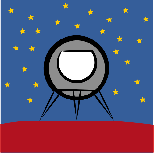This features a unique spacecraft with a large window in the center, floating against a backdrop of a blue sky filled with yellow stars. The craft appears to be circular and has a gray color scheme. It is situated on top of a red surface, which adds an interesting contrast to the overall scene. The combination of the spacecraft's design and its positioning against the star-filled sky creates a visually striking image that captures the imagination.