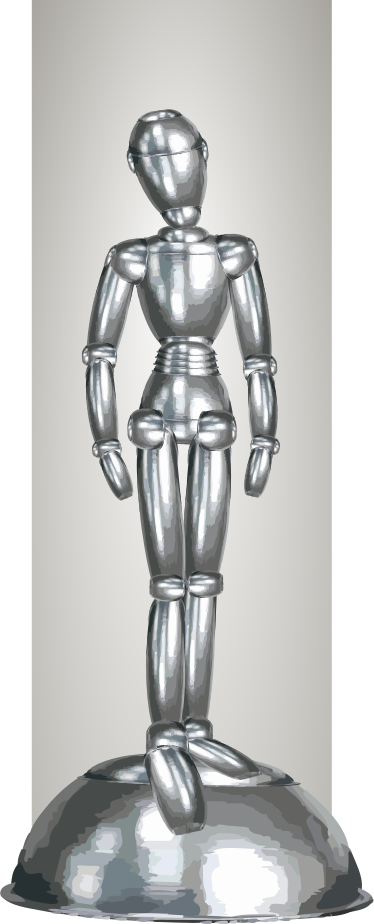This features a small robot statue standing on top of a silver base. The robot is positioned in the center of the scene, with its legs spread apart and arms at its sides. It appears to be an award or trophy, possibly made from metal or another metallic material. The statue's design gives it a unique and intriguing appearance, making it stand out as a focal point within the image.