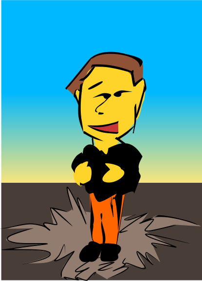 This features a cartoon drawing of a man wearing a black shirt and orange pants. He is standing in front of a yellow background, giving the impression that he is smiling. The man's skin tone appears to be yellow, which adds to his unique appearance. This creative illustration showcases an artistic interpretation of a person with a distinctive color scheme.