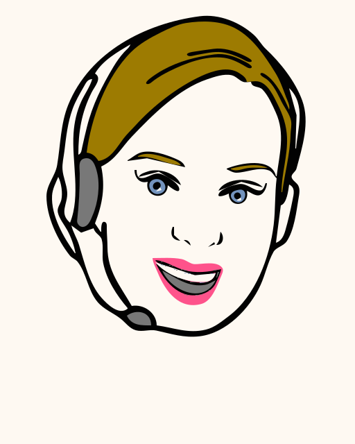 This features a woman with brown hair and wearing headphones. She is smiling, possibly talking over the microphone on her headphones. Her eyes are blue, adding to her pleasant expression. The cartoon-like drawing of the woman gives it an animated feel, making it appear as if she's speaking directly into the viewer's ear.