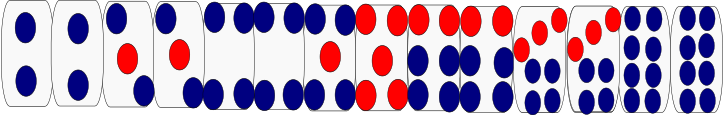 This features a large number of red and blue dominoes arranged in rows. There are at least 13 rows of dominos, each containing multiple pieces. The dominos vary in size and position, with some being larger than others and some placed closer to the edges of the image. Overall, it is an intriguing display of these popular game pieces.