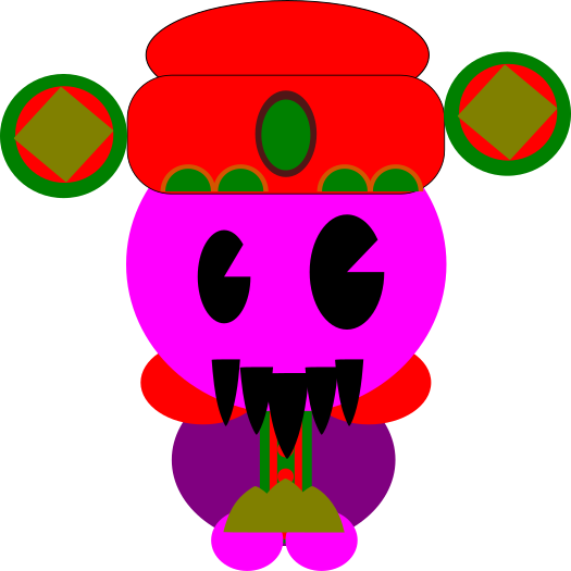 This features a colorful, cartoon-like character with a red hat and a pink body. This character has a mouth that appears to be open, giving it an evil or menacing appearance. The character is wearing a red hat on its head, which adds to the overall vibrant and playful nature of the image.