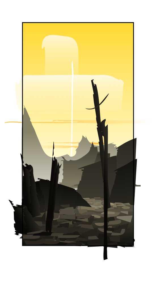 This features a scene of ruins with two wooden poles standing in the middle. The background is filled with a yellow sky, creating an interesting contrast against the darker tones of the ruins. The overall atmosphere suggests a sense of decay and abandonment, as if the area has been left to deteriorate over time. The presence of the wooden poles adds a touch of human intervention in this otherwise desolate landscape.