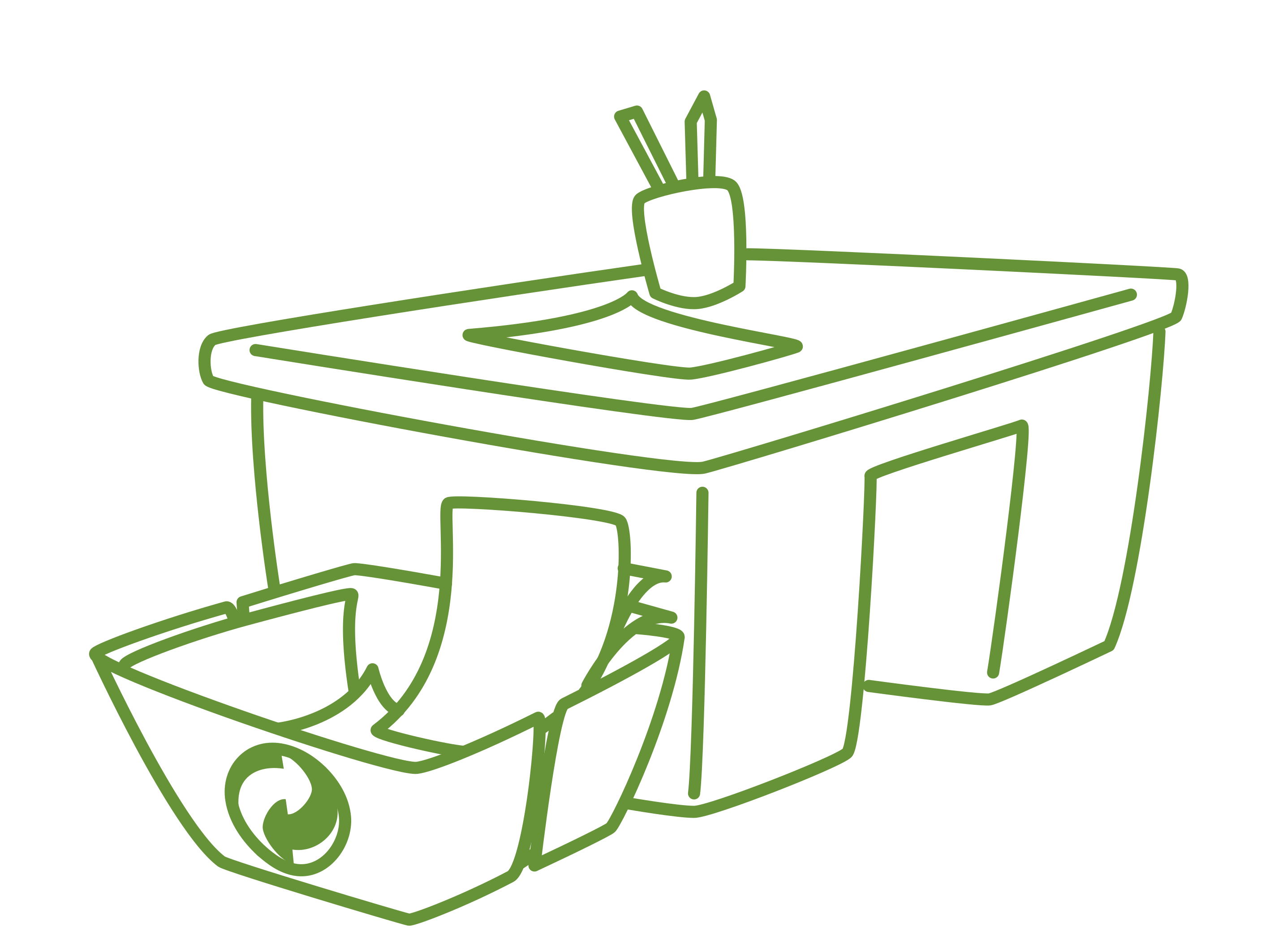 This features a white desk with a green outline, sitting on top of a table. Next to the desk is a recycle box, which adds an eco-friendly touch to the scene. Above the desk, there are two cups placed on the table, possibly for drinking or holding small items. The overall setting appears to be a workspace with a focus on sustainability and organization.