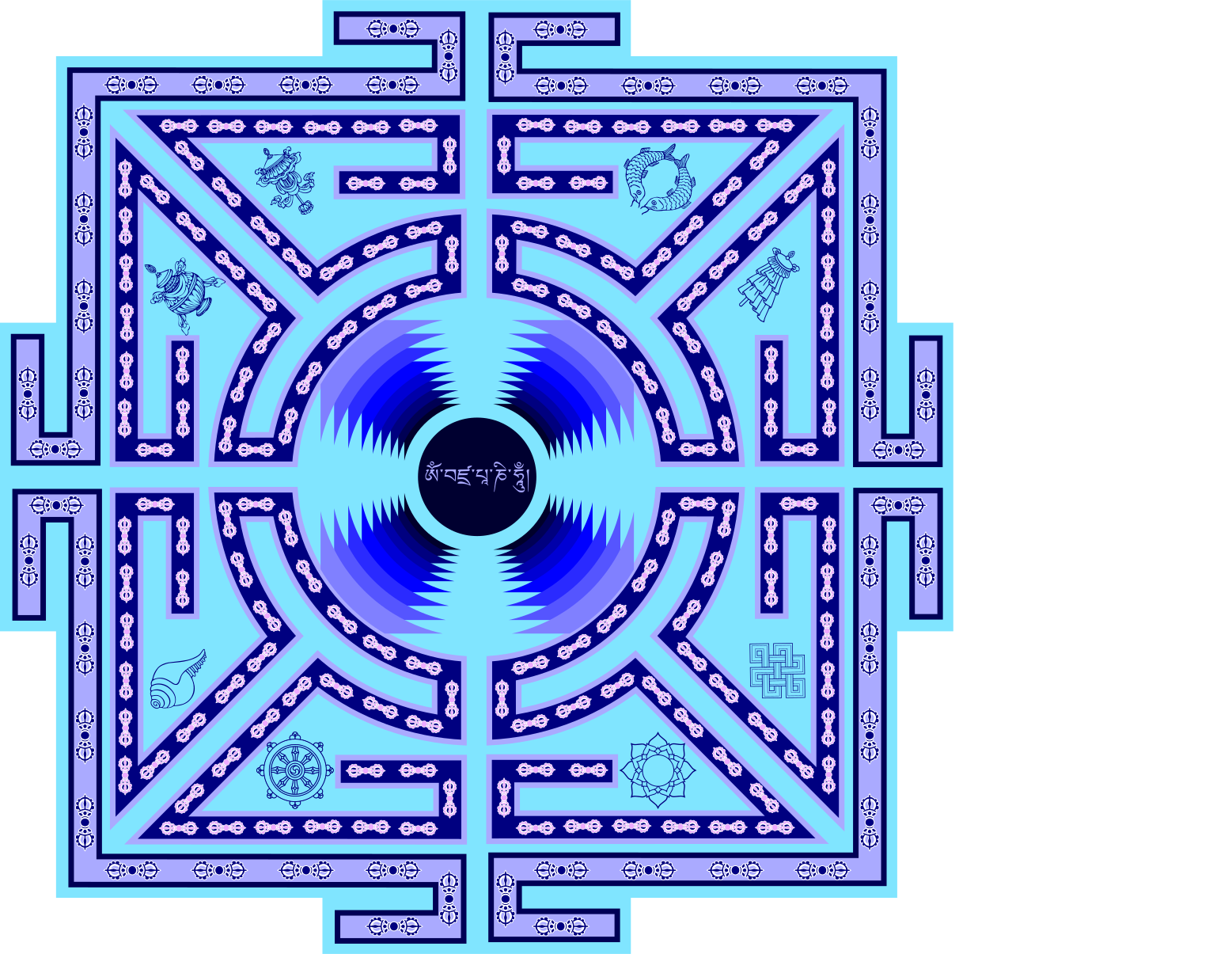 This features a blue mandala with a black circle in the center. It is a square-shaped design, and it has a blue background with red lines as decoration. The intricate pattern of the mandala creates an interesting visual effect that draws attention to its central point. This artistic piece could be used for various purposes such as meditation or simply as a decorative element in a room.