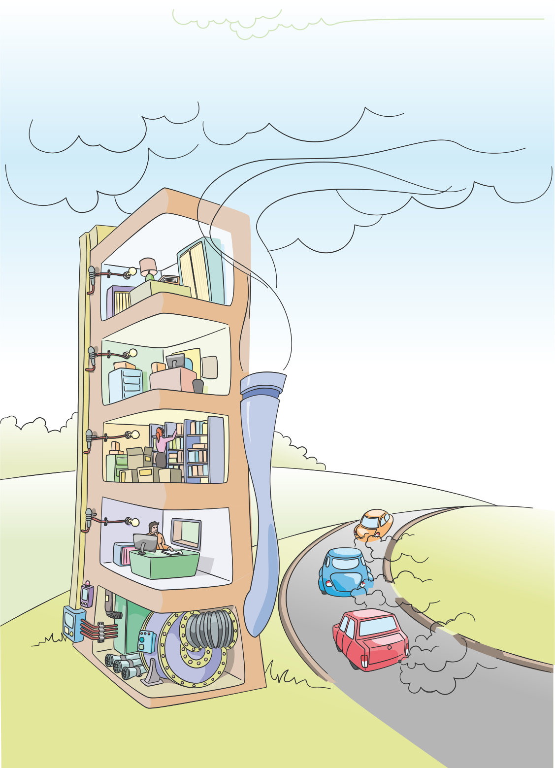 This features a large, four-story building with an open interior design. Each floor of the building is exposed to the outside, allowing people to see inside. A long pipe is attached to the side of the building and it appears to be letting out smoke. On the road next to the building, there are several cars parked or driving by. The scene gives off a sense of an urban environment with various elements like buildings, vehicles, and open spaces.