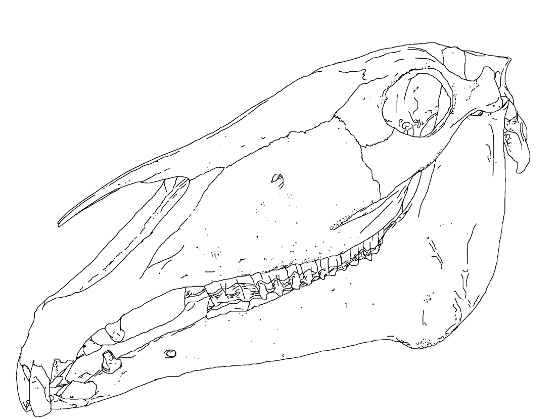 This features a close-up of an animal's skull, likely that of a horse. The skull is seen from the side and has a long shape with a full set of teeth. It appears to be white in color, but there is a black outline surrounding it. This drawing captures the intricate details of the skull, making it an interesting and detailed piece of artwork.