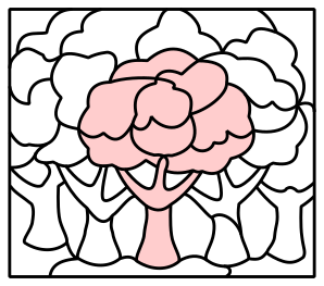 This features a tree with pink leaves and branches, surrounded by other trees. It appears to be an artistic drawing or template that can be used for various purposes such as puzzles or decorations. The tree is the central focus of the picture, and its unique design makes it stand out among the other trees in the scene.