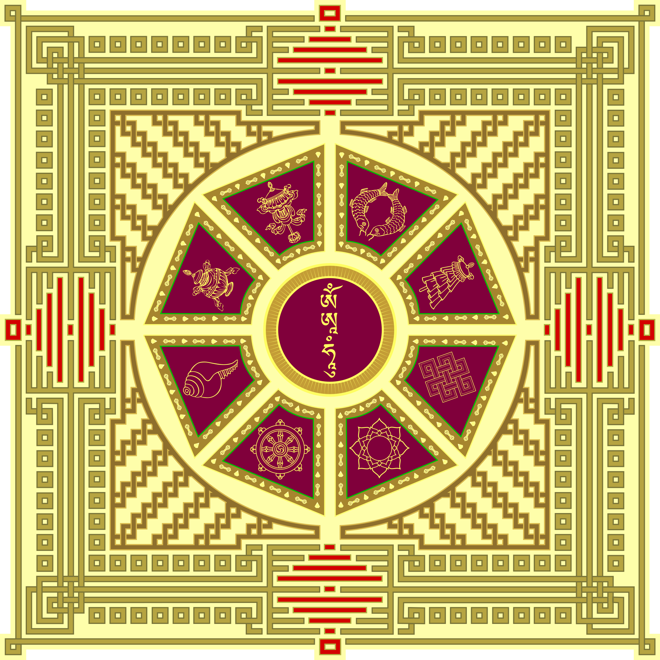 This features a large, intricate yellow mandala with red accents. It is square-shaped and has many linear elements throughout its design. Inside the mandala, there is a red circle that adds to its visual appeal. This artistic piece appears to be inspired by ancient Chinese culture, as it incorporates various symbols and designs commonly found in such artwork. The mandala's vibrant colors and detailed patterns make it an eye-catching centerpiece for any space where it is displayed.