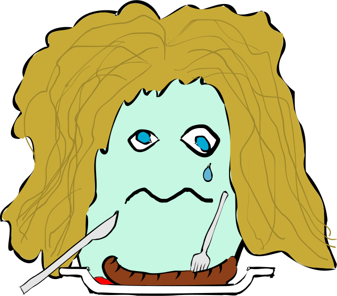 This features a cartoon character with blonde hair, blue eyes, and a sad expression. This character is holding a fork in one hand and a knife in the other while sitting in front of a bowl filled with food. The food appears to be unappetizing or bad, which has caused the character to cry. The scene is set against a white background that highlights the cartoon character's features.