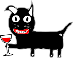 This features a black cat with a glass of wine in its mouth, giving the impression that it is drinking from the glass. The cat's facial expression appears to be smiling or amused as it holds the wine glass. The scene is depicted in a cartoon-like style, which adds a playful and whimsical touch to the image.