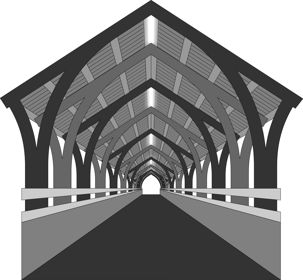 This features a large, covered bridge with an arched roof that spans across the entire scene. The bridge is made of wood and has a unique design, giving it a distinct appearance. The structure appears to be open on both ends, allowing for easy passage through for vehicles or horses. The overall impression is one of a long, narrow pathway that leads into the distance, creating an interesting visual effect.