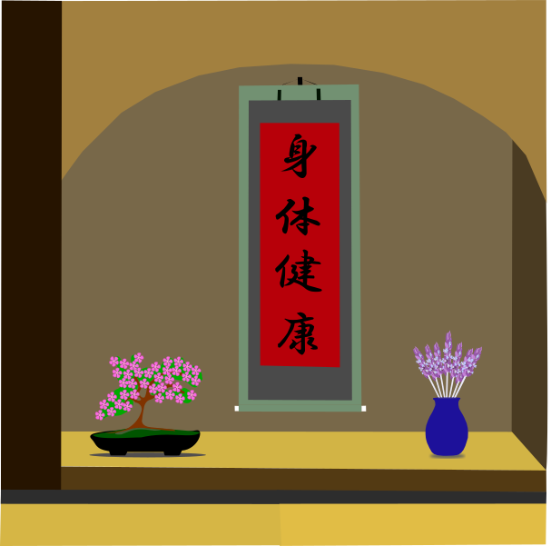 This features a beautifully decorated room with an oriental theme. A large red and white sign hangs on the wall, adding to the room's charm. In front of the sign is a small potted plant with purple flowers, creating a visually appealing scene. There are also two vases in the room, one placed near the left side of the image and another towards the right side. The combination of these elements creates an inviting atmosphere for anyone entering the space.
