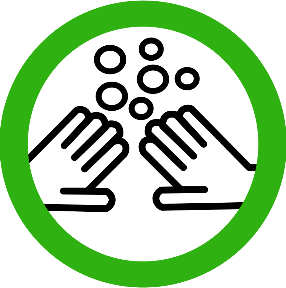 This features a green circle with an illustration of two hands holding up three fingers. This sign is likely meant to convey the importance of handwashing, as it emphasizes the act of washing one's hands with soap and water. The hands are positioned in such a way that they appear to be reaching out towards each other, further reinforcing the idea of cooperation and teamwork when it comes to maintaining good hygiene practices.