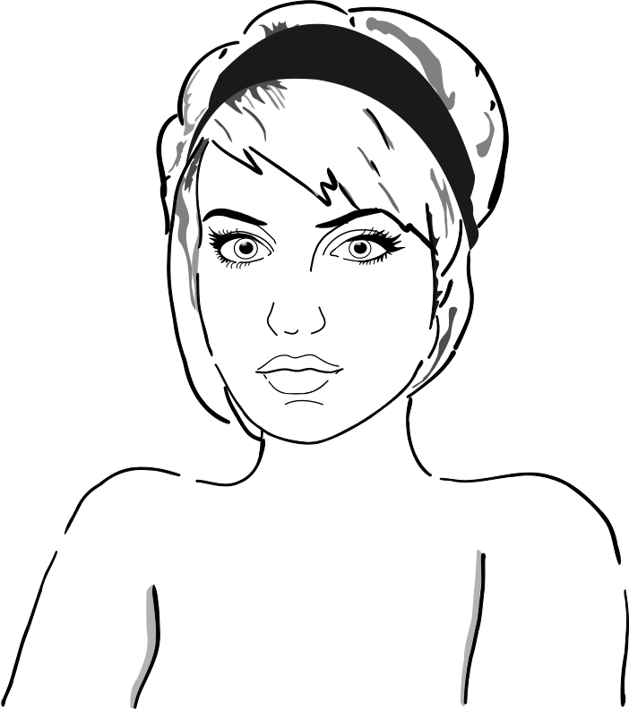This is a black and white portrait of a woman with short hair, wearing a headband. She has a pouty expression on her face as she looks straight ahead. Her lips are slightly parted, giving the impression that she might be about to speak or smile. The drawing captures the essence of the woman's features and expressions, making it an interesting piece of artwork.