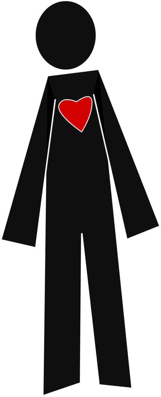 This features a black silhouette of a person with a red heart on its chest. This figure is standing against a white background, which creates a striking contrast between the two colors. The heart symbolizes love or affection and adds an emotional element to the otherwise simple outline of the human form. The use of a silhouette emphasizes the shape and structure of the person without any additional details, making it a minimalist representation of the concept.