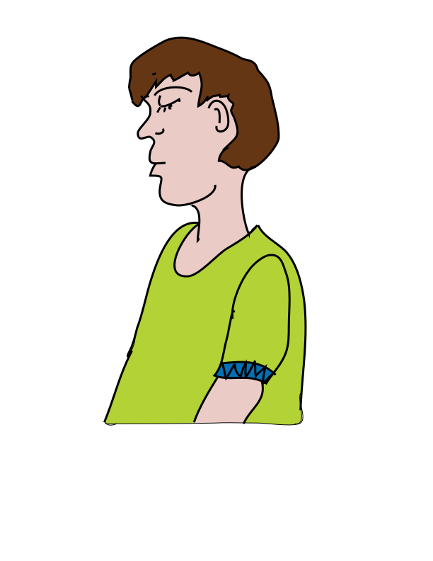 This features a cartoon drawing of a man wearing a yellow shirt. He has a blue bracelet on his left wrist and appears to be looking downward, possibly with a sad expression. The man is depicted in profile view, giving the viewer an interesting perspective of his facial features and attire.