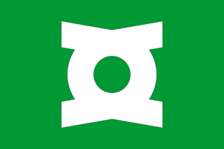 This features a green background with a large white circle in the center. This circle is shaped like a shield and has an emblem on it, resembling a logo for the DC Comics character Green Lantern. The design of the circle is reminiscent of a Celtic cross, giving it a unique and eye-catching appearance.