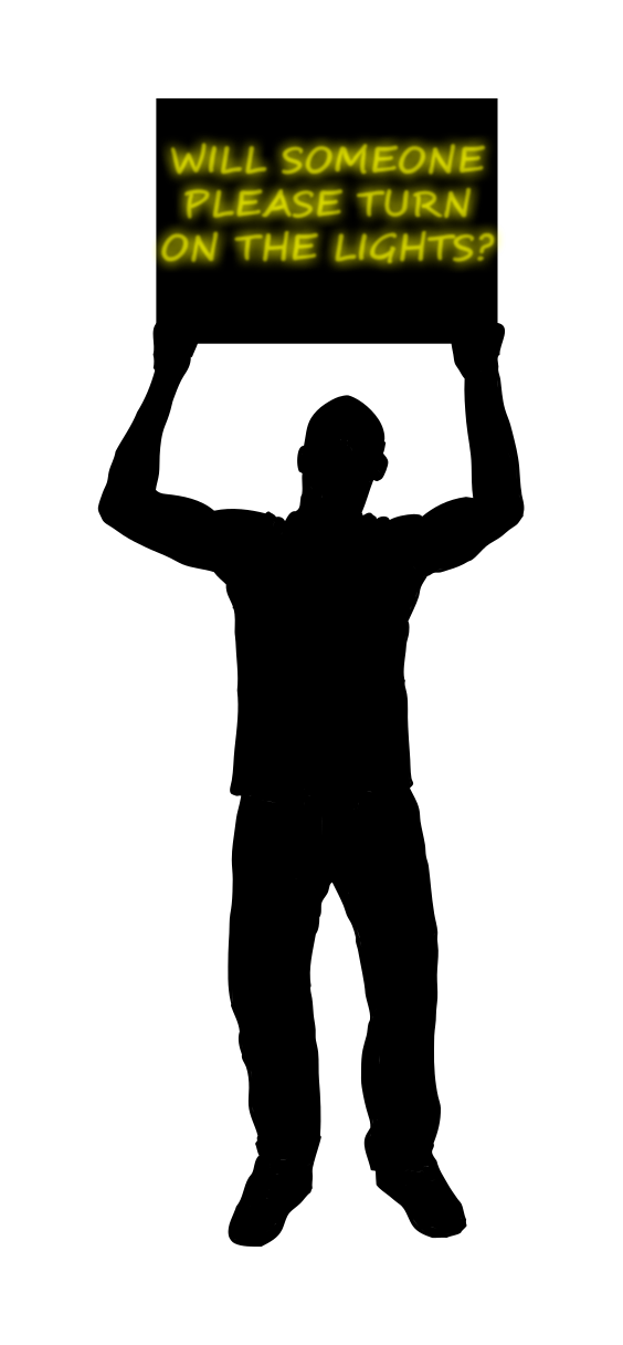 This features a man holding up a sign with the words "Will someone please turn on the lights?" written on it. He is standing in front of a building, possibly asking for assistance or expressing frustration about the lack of lighting. The man's silhouette is black, which adds to the dramatic effect of his message.