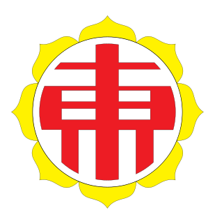 This features a red and yellow circle with an Asian symbol in the center. The symbol is surrounded by a yellow border, giving it a distinctive appearance. The combination of red and yellow colors creates a vibrant and eye-catching design that stands out against its background. This unique symbol could be used for various purposes such as decoration or representing cultural heritage.