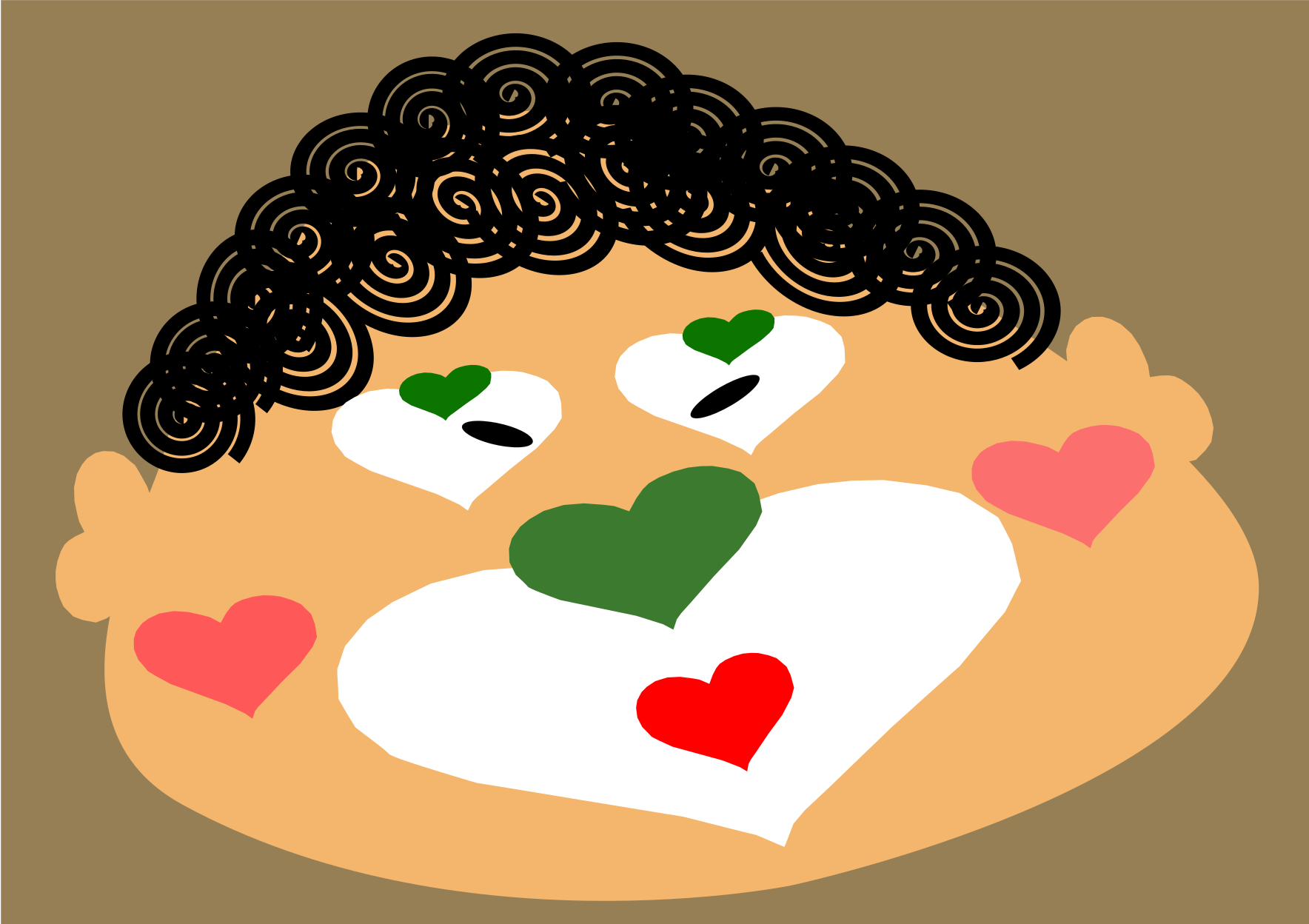 This features a cartoon man's face, with all of his facial features made from white, green, pink, or red hearts. This unique design gives the impression that the man is wearing a heart-shaped mask. His curly black hair is prominently displayed on top of his head, adding to the overall whimsical and playful nature of the illustration. The use of hearts as facial features creates an interesting visual effect, making it stand out from typical cartoon characters.