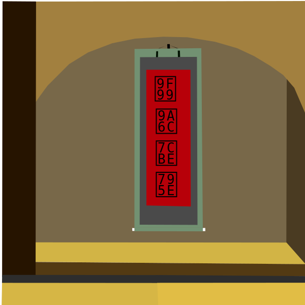 This features a red and green sign hanging on the wall of a building. The sign is positioned above a window, making it easily visible to passersby. The colors of the sign are predominantly red with some green accents, creating an eye-catching display. The sign appears to be related to numbers or possibly a code, as there are several digits and letters on its surface. Overall, the scene conveys a sense of organization and attention to detail in the building's design.