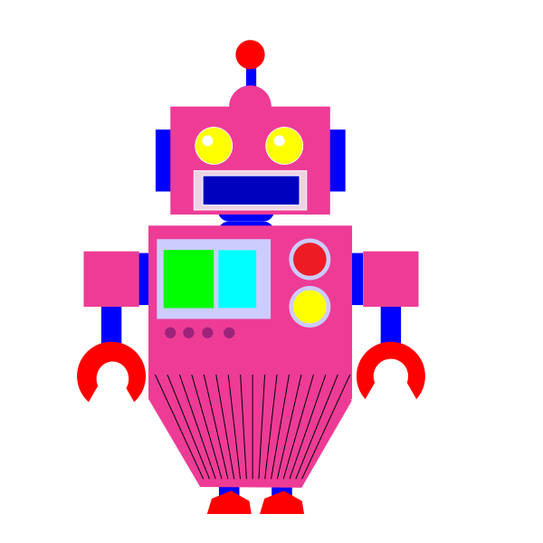 This features a pink robot with yellow eyes and buttons, standing in the center of the frame. It appears to be an illustration or cartoon-like character, possibly representing a futuristic or technological theme. The robot's design is reminiscent of a classic video game character, giving it a nostalgic feel. The pink color and yellow eyes add a playful touch to the overall appearance of the robot.
