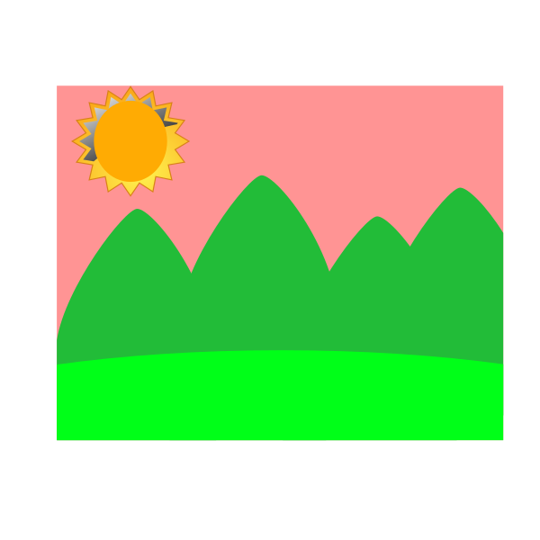 This features a brightly colored, sunny scene with a large yellow sun in the sky. The sun is positioned towards the left side of the frame and appears to be rising above the horizon. In front of the sun, there are three green mountains that stretch across the background, creating a picturesque landscape. The vibrant colors and the presence of the sun make this image feel warm and inviting.