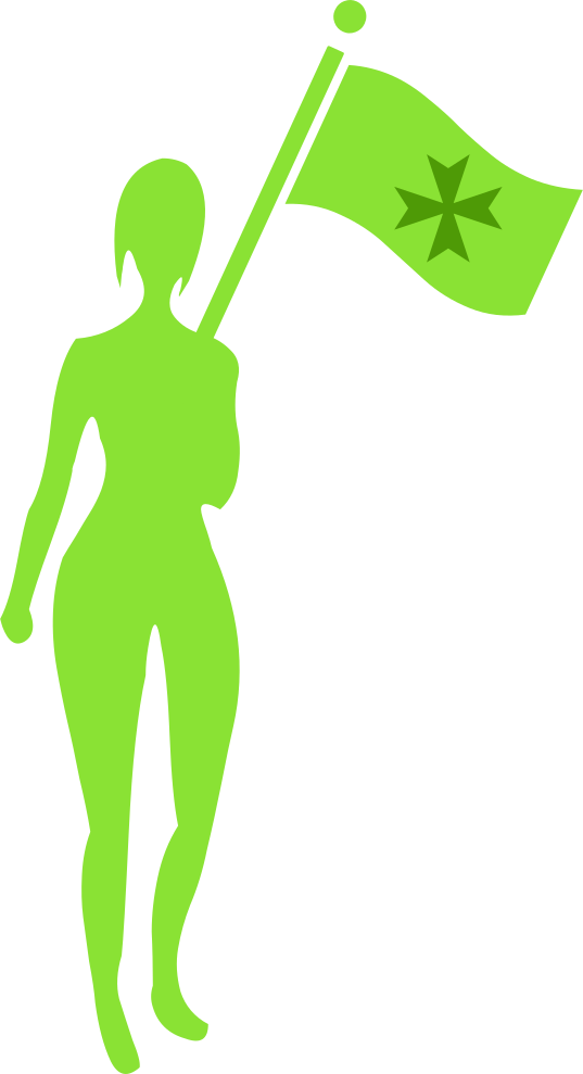 This features a woman dressed in green, holding up a flag with a yellow star on it. She is standing against a backdrop of a brown and white striped flag. The woman's outfit consists of a green top and bottoms, which are visible as she proudly displays the flag. The scene appears to be a celebration or a display of patriotism, with the woman being the center of attention.