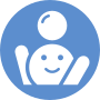This features a blue circle with an icon of a child sitting in a chair. The child is smiling and appears to be playing with a ball, which is located near the center of the image. The overall scene gives off a sense of happiness and playfulness.
