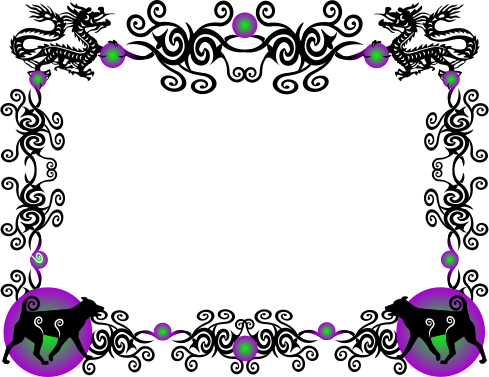 This features a beautifully designed frame with an oriental theme. The frame is adorned with swirls and intricate patterns, giving it a unique and elegant appearance. In the center of the frame, there are two dogs, one on each side, adding to its charm. These dogs appear to be the zodiac signs for the years 2014 and 2015, making this an interesting and creative design. The overall effect is a visually appealing piece that showcases both artistic skill and cultural significance.