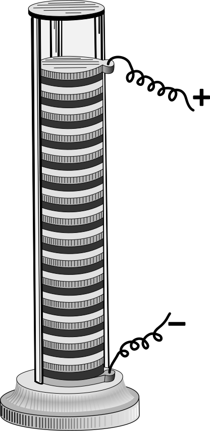 This features a Voltaic cell with wires attached to it. It has a row of batteries stacked on top of each other, creating an interesting visual effect. The bottom and top of the cell are connected by wires, which add to its functionality as an electrical device. This particular Voltaic cell is designed in such a way that it can be easily assembled or disassembled, making it versatile for various applications.