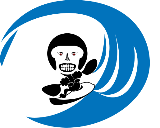 This features a black and white skull wearing a helmet, riding a surfboard on top of a wave. The skull is positioned in the center of the scene with its surfboard beneath it. The wave itself has a blue hue, adding to the overall color scheme of the image.