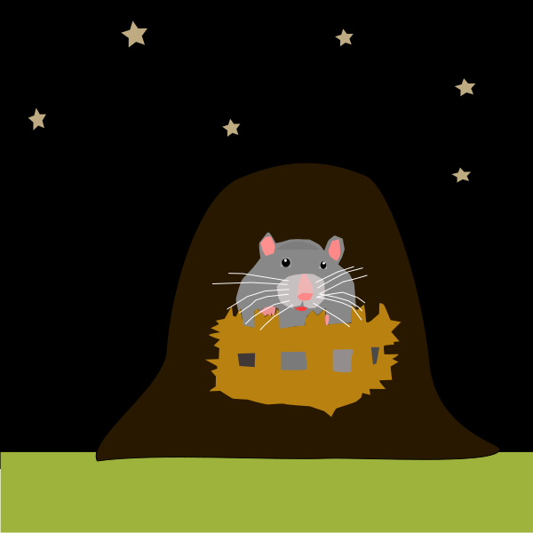 This features a cute cartoon mouse sitting in a small wooden nest. It appears to be resting or hiding within the nest, which is placed on top of a bed. The scene has a cozy and warm atmosphere with the mouse being surrounded by hay, giving it a sense of comfort. The night sky serves as the backdrop for this charming image, adding an element of mystery and tranquility to the overall composition.