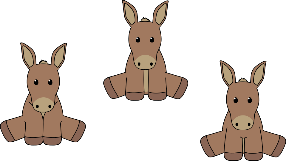 This features a group of three brown donkey toys sitting on the ground. Each toy is positioned in a slightly different angle, giving them a unique appearance. They are all placed next to each other, creating an interesting visual effect. These cute and colorful toys are likely designed for children or as decorative items, adding a touch of whimsy to any space they occupy.