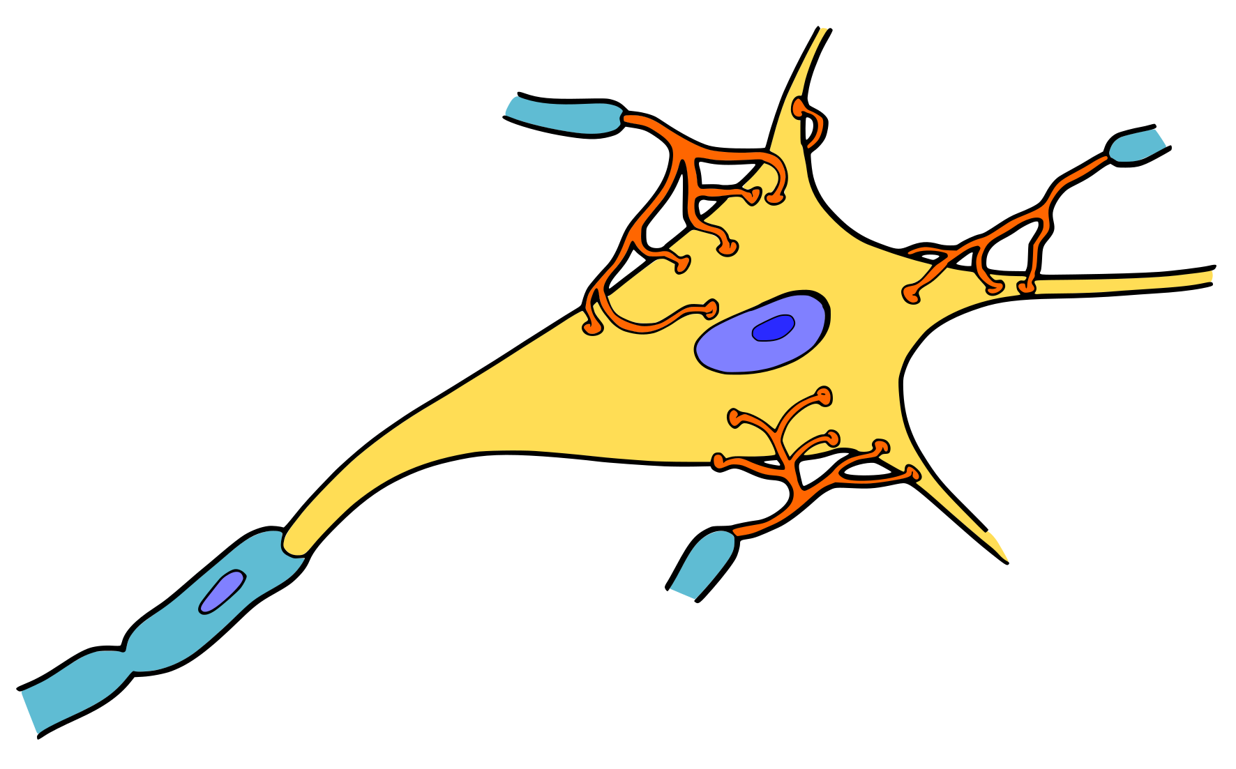 This features a detailed drawing of a neuron, which is the basic unit of the nervous system. It consists of multiple branches and connections that are essential for transmitting signals throughout the body. The neuron in this illustration has a unique blue and yellow color scheme, making it visually striking. The intricate details of the neuron's structure are depicted with precision, showcasing its complex network of connections and pathways. This drawing provides an excellent representation of the fascinating inner workings of the human body.