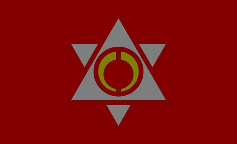 This features a red and white flag with a yellow circle in the center. This circle is adorned with an orange ring, giving it a unique appearance. The flag appears to be a symbol of some sort, possibly representing a specific organization or location. The combination of red, white, and yellow colors creates a visually striking design that stands out against its background.