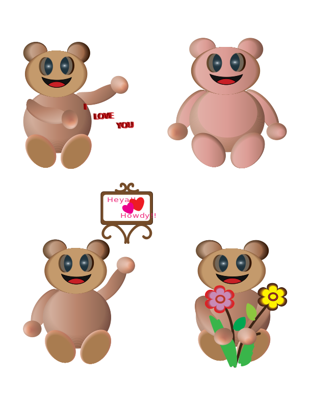 This features a set of four different teddy bears, each with unique characteristics. They are all holding signs or flowers, and their expressions convey love and affection. One bear is wearing a heart sign, while another has a "love you" message on its sign. A third bear holds a flower in its hand, adding to the warmth of the scene. The fourth teddy bear appears to be waving at someone, further emphasizing the friendly nature of these cuddly creatures. Overall, this delightful collection of teddy bears is sure to bring joy and comfort to anyone who sees them.