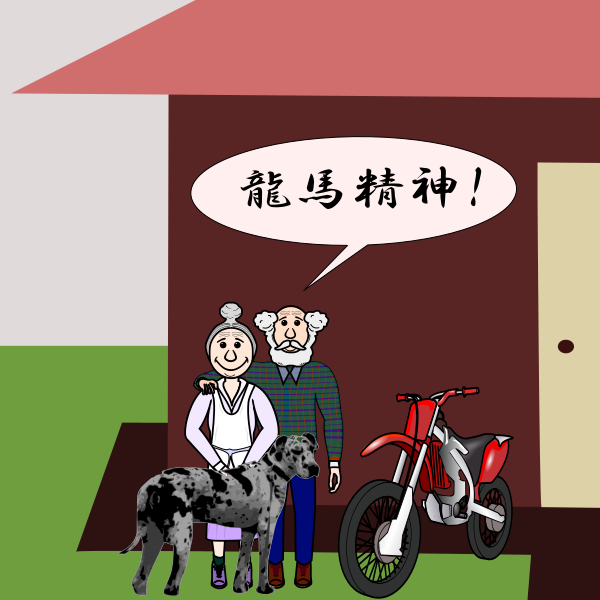 This features an elderly couple standing next to a red motorcycle, with the man holding a dog in his arms. They are surrounded by a few other dogs, and there is also a sheep nearby. Above them, there is a sign that says "Please stay vigorous and vivid like the Chinese fabled creature 'dragon-horse' even when you get older." The scene appears to be set outdoors with a house in the background.