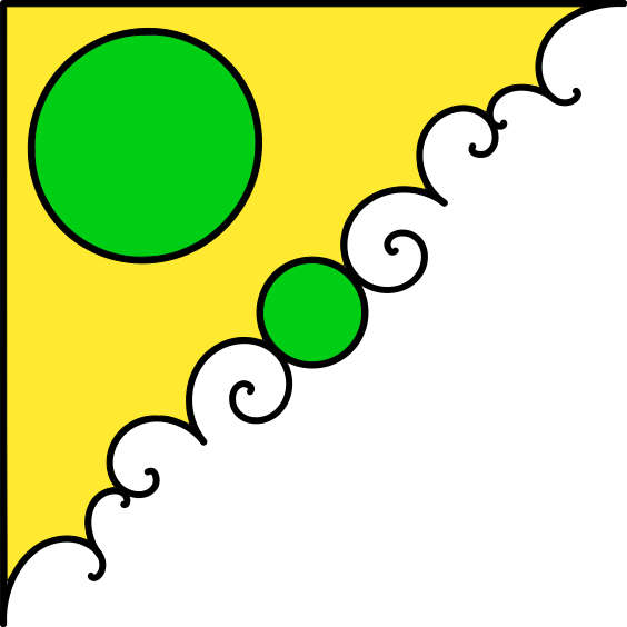 This features a yellow and green decoration with two circles. One circle is in the middle of the design, while the other is located outside of it. The decoration has a wavy pattern, giving it an artistic appearance. The combination of colors and swirls creates a visually appealing piece that can be used for various purposes such as wall decorations or home accessories.