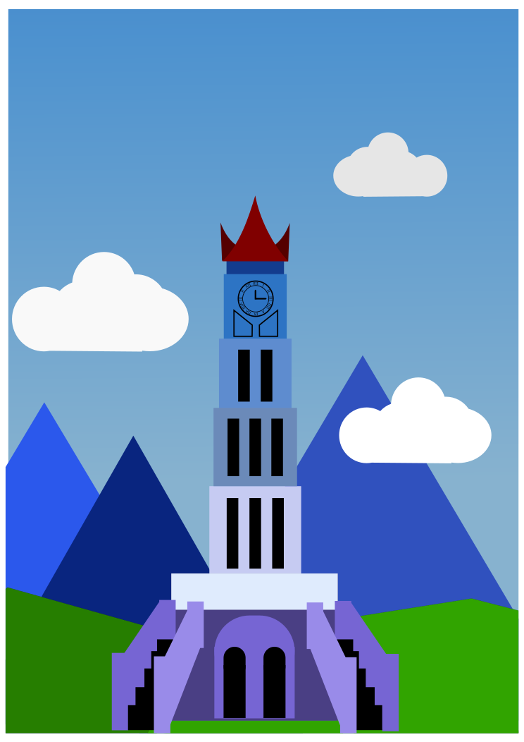 This features a large, blue and purple clock tower with a red roof. It stands tall in the middle of a lush green field, surrounded by mountains that provide a picturesque backdrop. The sky above is filled with clouds, adding to the overall atmosphere of the scene. This unique combination of elements creates an interesting visual experience for viewers.