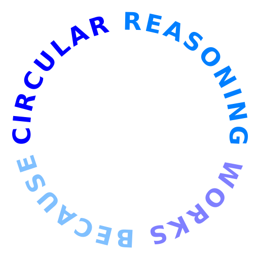 This features a circular shape with the words "circular reasoning works because" written in blue. This phrase is displayed on a white background, making it stand out against the color of the circle. The design of this circle is unique and eye-catching, as it combines both text and visual elements to convey its message.